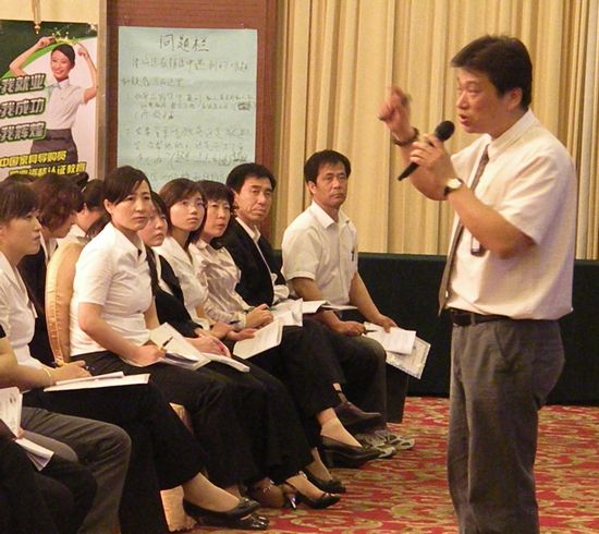 國富縱橫實戰派高級導師代海成老師在訓練營舉辦前就進行了為期兩周的店面調研、導購員訪談,通過在門店與導購員深入交流獲得了專業手資料,在訓練營中通過《王牌導購員實戰銷售技巧》和《家具銷售實戰禮儀》兩堂課將導購員們很關心、很難解決的銷售難題一一化解,代老師激情、幽默、流暢的授課方式深受學員們喜歡,在課堂上學員們紛紛與代老師互動,在代老師的精心指導下學員們都得到了滿意的答復。